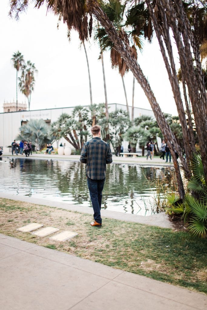 Ben had a plan for her to have a girls day in San Diego as the perfect cover. The day arrived and Balboa Park was PACKED. Turns out the day after Christmas means everyone is out and about! Little did Taelor know that Ben would be there along with their families and closest friends! Also me there creepily hiding with my cameras like a small stalker. By some miracle not one person involved had given away this big surprise. Her friends rushed Taelor into running so they “wouldn’t miss the sunset”. Meanwhile Ben was pacing the edge of the pond with a dozen roses and a ring he designed for her.
